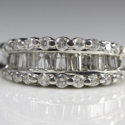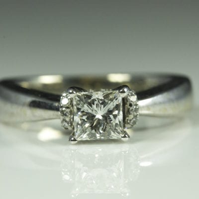 14k White Gold Princess Cut Diamond Ring w/ Melee Diamond Collar Along Gallery and Shoulders – D635