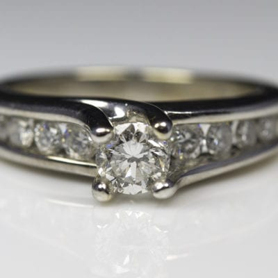 14k White Gold RBC Diamond Engagement Ring w/ Channel Set Melee Diamond in Bypass setting and Fitted Band That Has 2 Melee Diamonds – F518